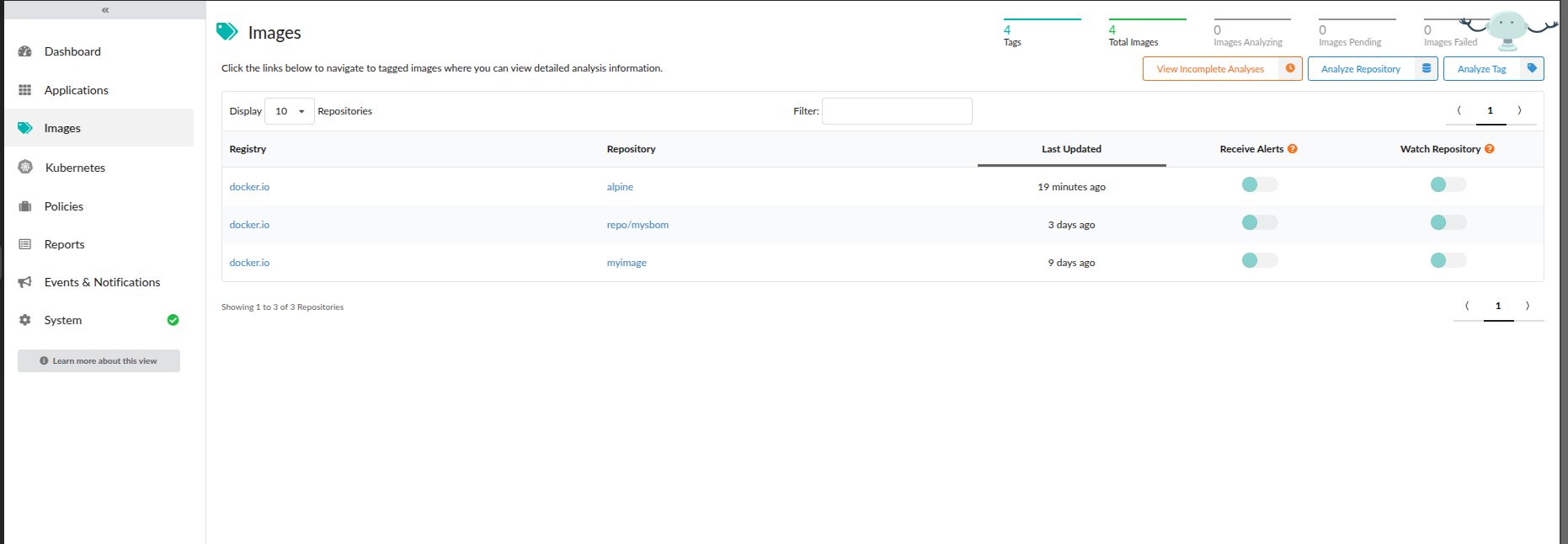 You will be presented with the Image Analysis view. On the right-hand side of this view you will see the Analyze Repository and Analyze Tag buttons: