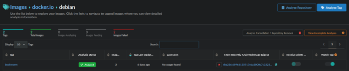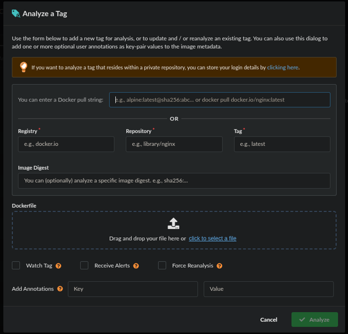 In the Images tab, click Analyze Tag. You can either enter the Docker pull string for the container image you want to analyze or provide the registry, repository, and tag details in their respective fields. To learn more about adding a registry, see this guide.