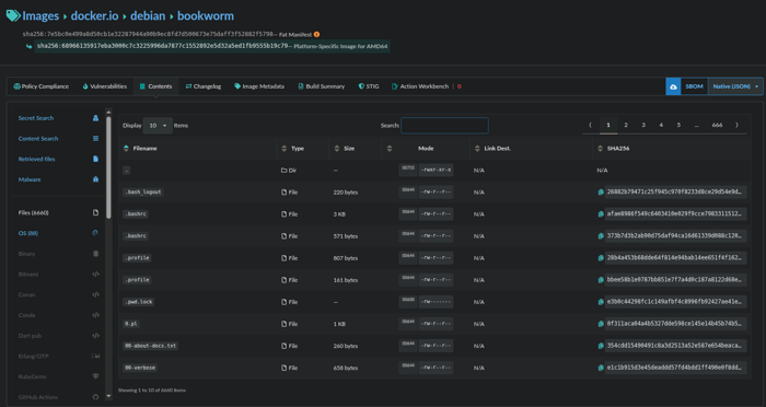 To view the SBOM, go to the Images tab and open the image’s detail view. Select the image tag, then navigate to the Content tab on the tag report page. Here, you can browse the SBOM components organized by content type. If you need to download the SBOM, an export/download icon is available in the upper-right corner of the page.