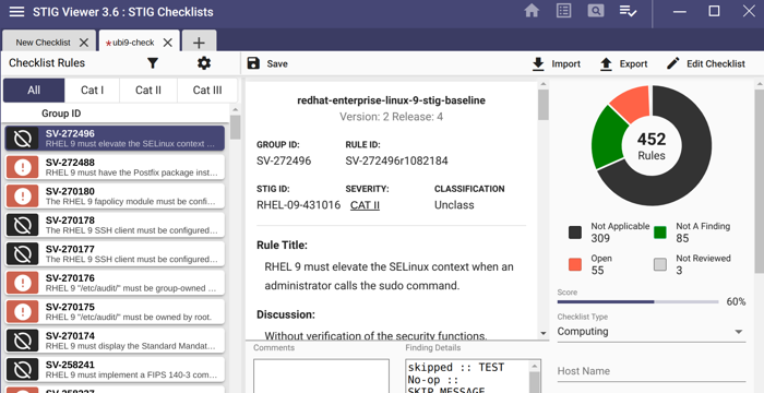 You can easily filter what passed, failed, not reviewed and not applicable. The data can be exported as a DISA Checklist or as XCCDF Results as indicated in the picture below: