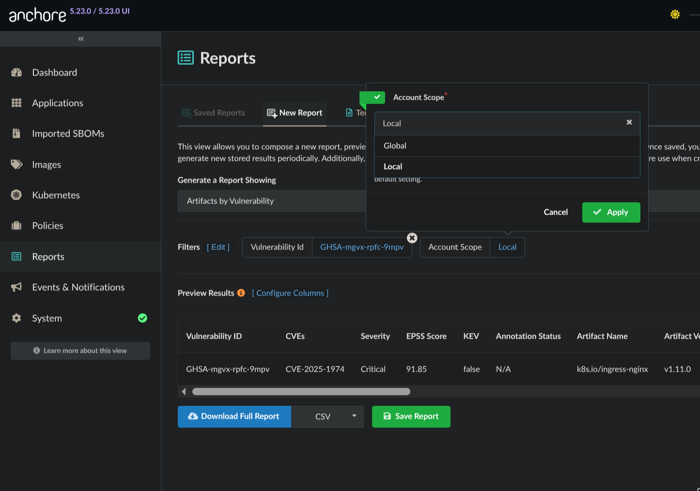 As you preview results, you can toggle the report scope. If you are the administrator you can run the report against all assets across all accounts.