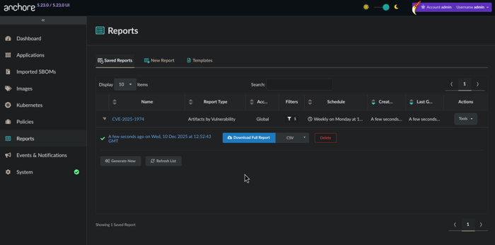 The report will then be generated in order to provide you results across the SBOMs for all of your assets. Once complete, the results are ready for download.