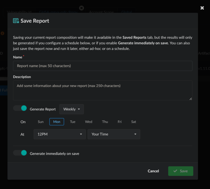 Once you have validated the desired outcome in the report preview, you can opt to Save Report, provide some details, and tick the option to Generate immediately on save.