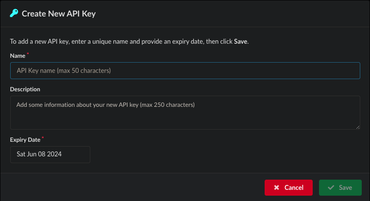 - Expiry Date: An expiry date for your API key, you cannot specify a date in the past and it cannot exceed 365 days by default.